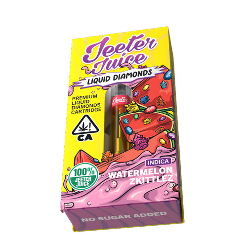 Jeeter Watermelon Zkittlez. This strain is a hybrid of big heavyweights Zkittlez and Watermelon. Jeeter carts. It has a delicious fruity scent and flavor profile. Its high may come on swiftly, leaving you feeling euphoric and powerful.